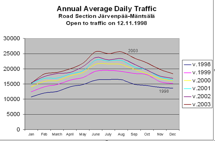 Liikenteellisesti hiljaisen tammikuun 2004 luku välillä Mäntsälä-Järvenpää oli 17.000 ajoneuvoa ja Mäntsälä-Lahti välillä 16.000.