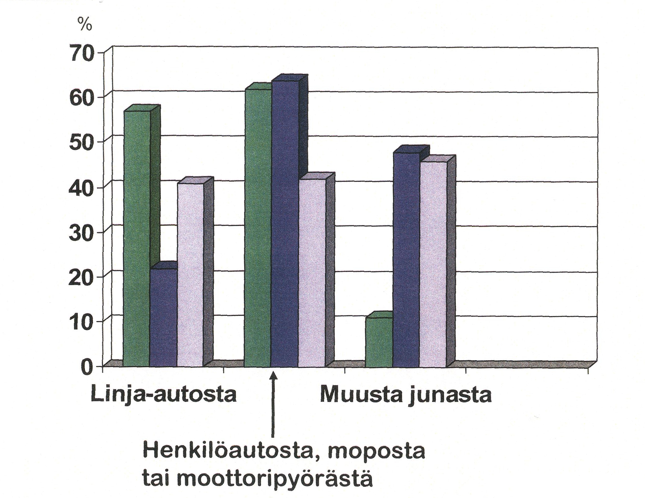 Kaikista suomalaisten tekemistä matkoista ajetaan henkilöautolla 85 prosenttia. Suosituin julkinen liikennemuoto on linja-auto. Busseja käytetään 6 prosenttia kaikista matkasuoritteista. Junaliikenne on kuronut selvän etumatkan lentoliikenteeseen. Junaa käyttää 5 prosenttia matkustajista ja muita liikkumisen muotoja kaksi prosenttia ihmistä.