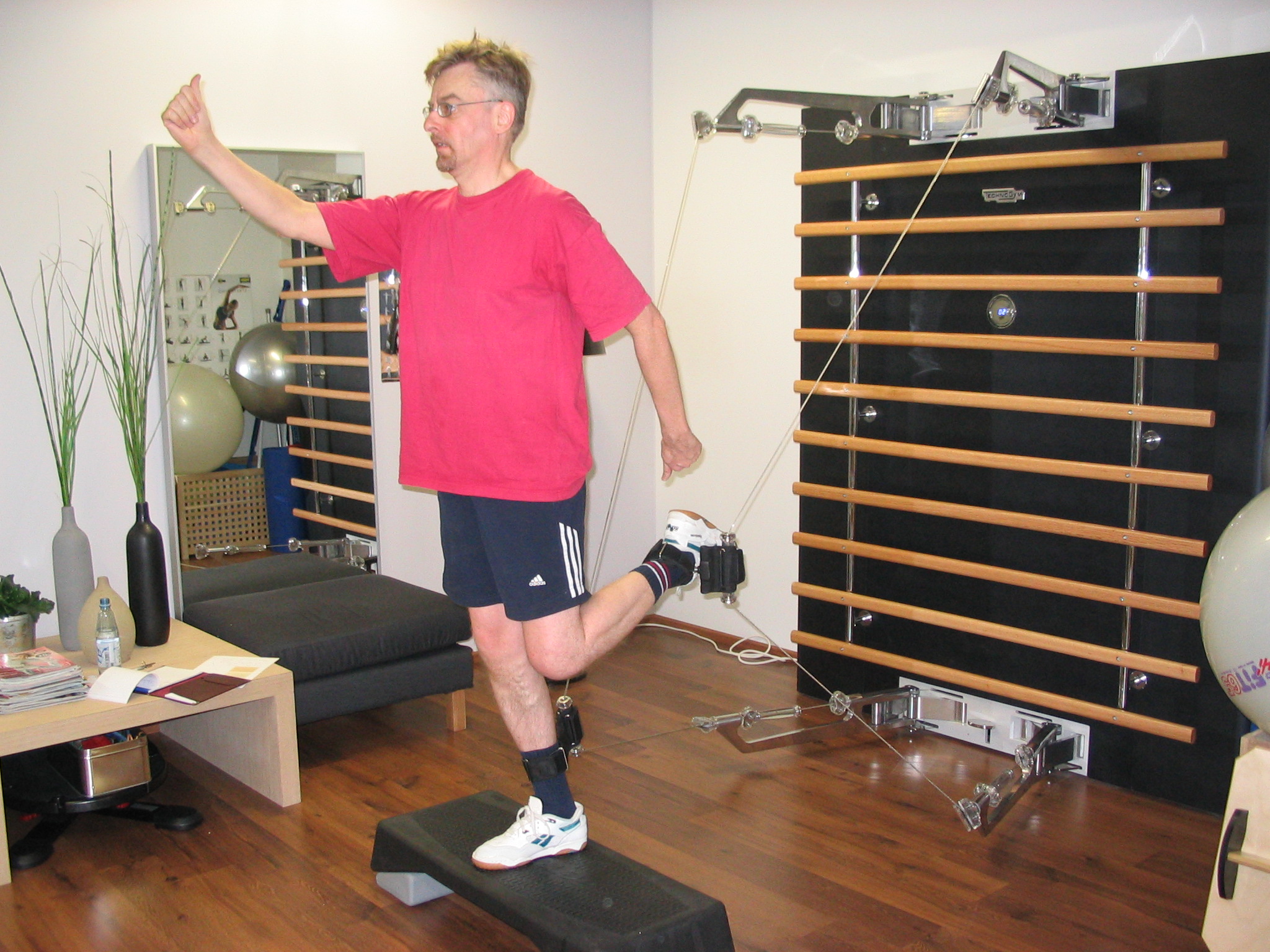 Lopuksi minut sidotaan jaloista vaijereihin ja teen askellusharjoituksia laudalle. Käsien koordinointi vaatii aivotyötä, mutta saan aikaan suhteellisen kauniin liikeradan tai ainakin niin kuvittelen. Lopuksi vielä askelhyppyjä vaijerit jaloissa. Hiki tippuu jo.