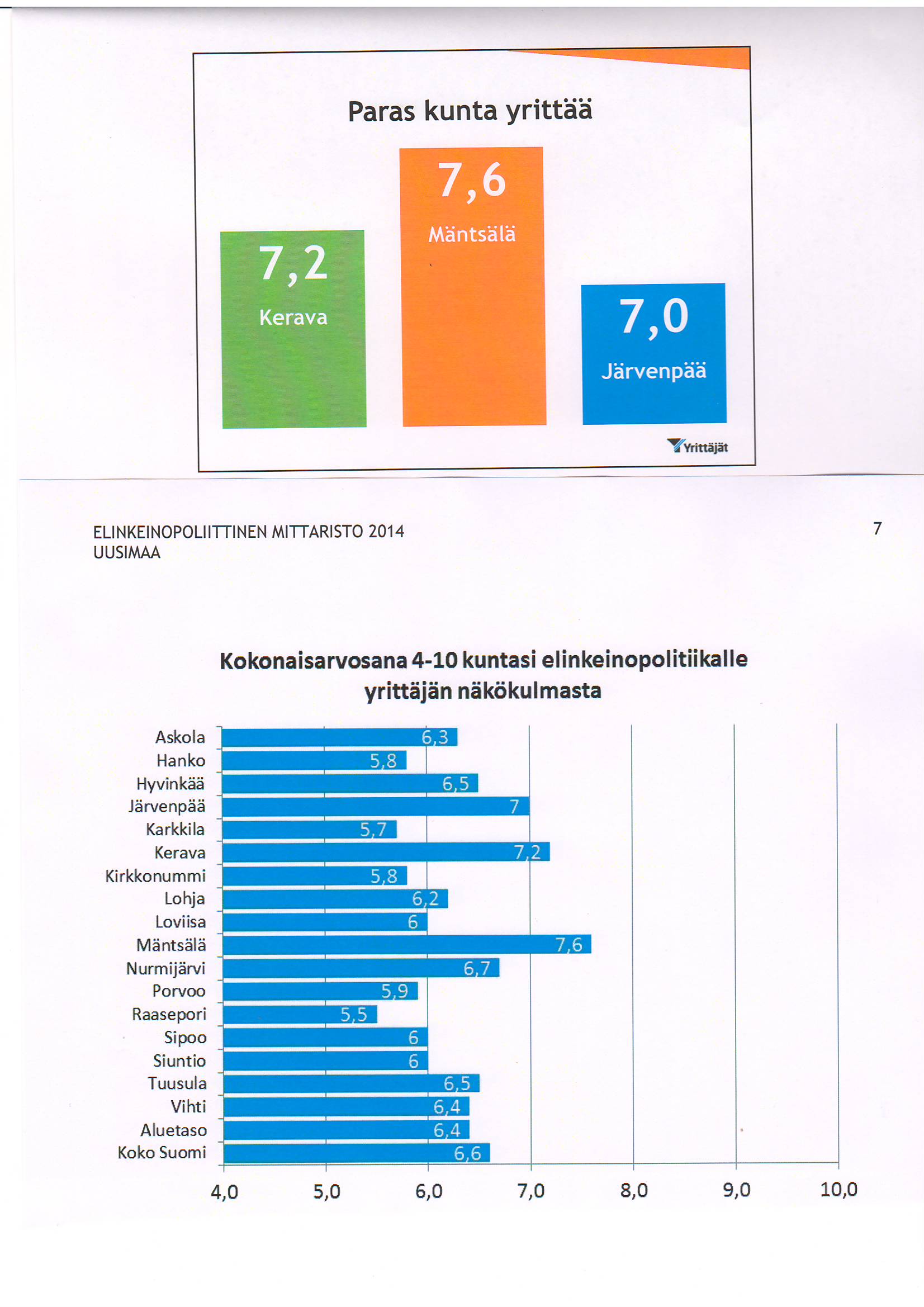 Suomen Yrittäjät ovat julkaisseet elinkeinopoliittisen mittaristonsa 2014. Mäntsälä on Uudenmaan kunnista ykkösenä. Mäntsälälle on eri osa-alueista annettu seuraavia pisteitä: