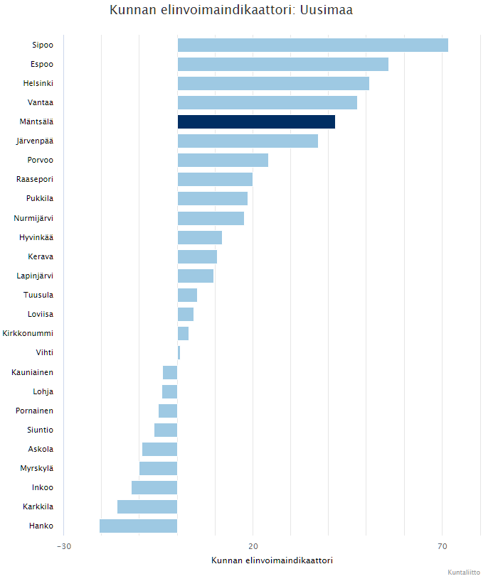 Suomen Kuntaliiton tuore elinvoimaindikaattoritilasto kertoo mihin suuntaan kunnat ovat elinvoimaisuudessaan menossa. Mäntsälä pärjää erinomaisesti. Tilastot antavat selkeän kuvan kunnan elinvoiman kehityksestä ja vertailusta muihin kuntiin. Uudenmaan vertailussa Mäntsälä on sijaluvulla viisi. Edellä olivat Sipoo, Espoo, Helsinki ja Vantaa.