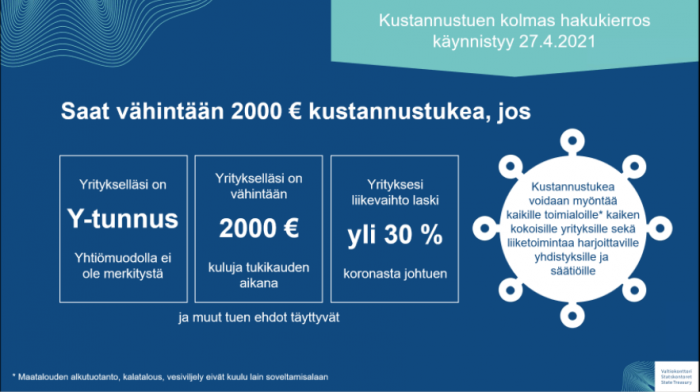 Kustannustuen kolmas hakukierros järjestetään 27.4.—23.6.2021. Haettavissa olevan tuen tukikausi on 1.11.2020–28.2.2021. Yritys voi hakea kustannustukea