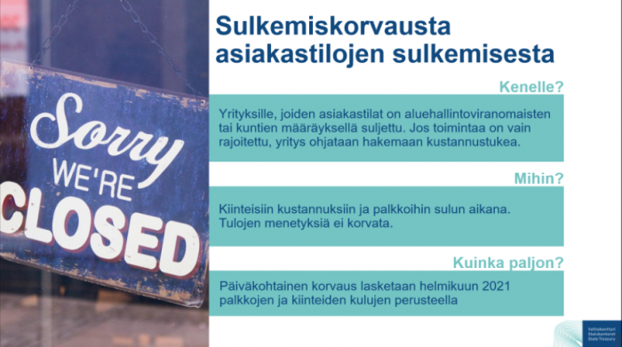 Sulkemiskorvaus avautuu hakuun toukokuun 12 päivä. Yritys voi hakea sekä kustannustukea että sulkemiskorvausta. Mikäli yrityksen toimintaa on rajoitettu sulkutoimenpitein osittain, esimerkiksi ravintoloiden tai liikuntapaikkojen asiakastilojen sulkeminen, voi yritys hakea sulkemiskorvausta niiltä osin.