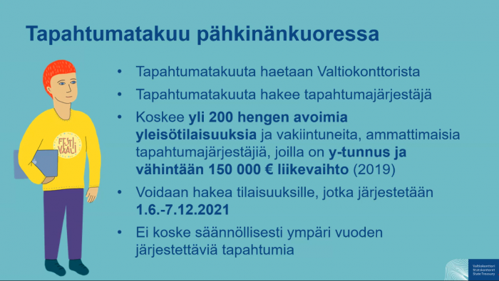 Tapahtumatakuu koskee vakiintuneita tapahtumajärjestäjiä jotka järjestävät yli 200 hengen yleisölle avoimia tapahtumia. Tälläisiä tapahtumia ovat esimerkiksi taide- ja kulttuurifestivaalit, konsertit ja näyttelyt, joita ei järjestä ympärivuotisen tapahtumatoiminnan osana.Tapahtumien toteutuksessa tulee noudattaa Terveyden ja hyvinvointilaitoksen (THL) sekä opetus- ja kulttuuriministeriön (OKM) hyväksymiä periaatteita vastuullisten tapahtumien järjestämiseksi koronatilanteessa