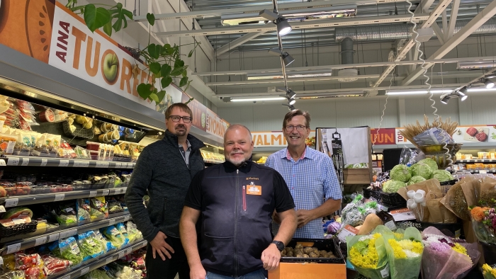 Juha Leinonen ja Harri Kari vierailulla K-Market Kaunismäessä yrittäjä Mikko Pirkolaa tervehtimässä.