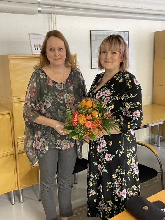 Kuvassa väistyvä puheenjohtaja Elina Alanko ja vuoden 2022 alussa puheenjohtajana aloittava Suvi Pirkola
