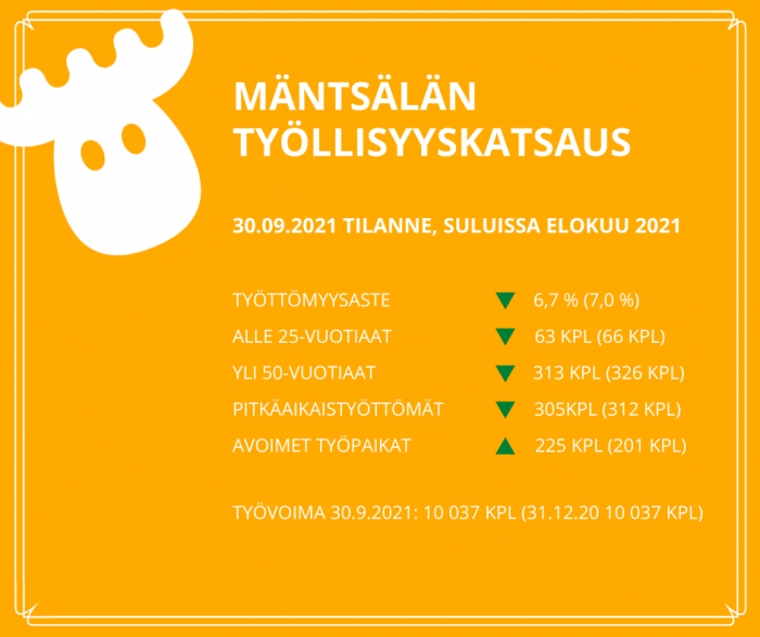 Mäntsälän työllisyyskuvuissa oli positiivinen vire syyskuussa. Kaikki luvut olivat parantuneet sitten elokuun. Uudellamaalla Siuntion 6%:n työttömyysaste oli alhaisin. Mäntsälä ja Pornainen pitivät kakkossijaa 6,7%:n työttömyysasteella. Koko Uudenmaan työttömyysaste oli 11%.