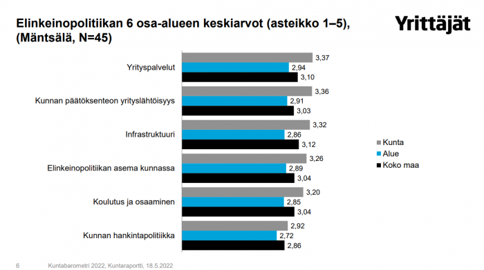 Elinkeinopolitiikan kuudella eri osa-alueella Mäntsälä oli kaikissa luokissa koko maata ja Uuttamaata korkeammalla (kuva 1). Kysyttäessä, tärkeimmiksi osa-alueiksi nimetään kunnan päätöksenteon yrityslähtöisyys (1), yrityspalvelut (2) ja elinkeinopolitikan asema kunnassa (3). Koulutuksen ja osaamisen osa-alue koettiin vähemmän tärkeäksi kuin koko maassa ja Uudellamaalla yleensä. Tämä on mielenkiintoinen huomio, kun ottaa huomioon kuinka paljon tällä hetkellä puhutaan jatkuvasta muutoksen tilasta ja kohtaanto-ongelmista, myös työntekiöiden osaamisen ja työnantajien tarpeen kohdalla.