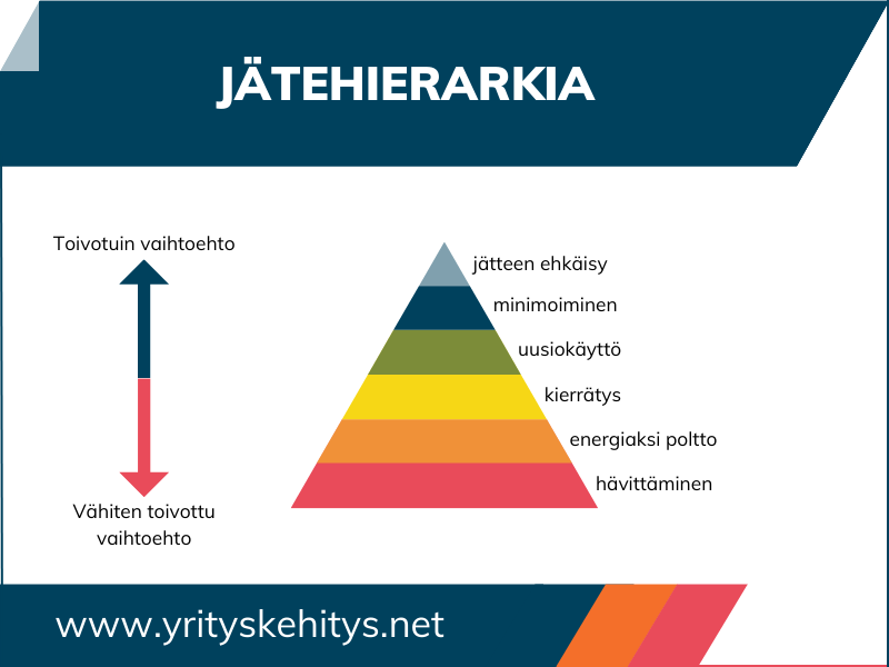 Kuvassa jätehierarkia, joka kuvaa materiaalien käyttötapojen priorisointia