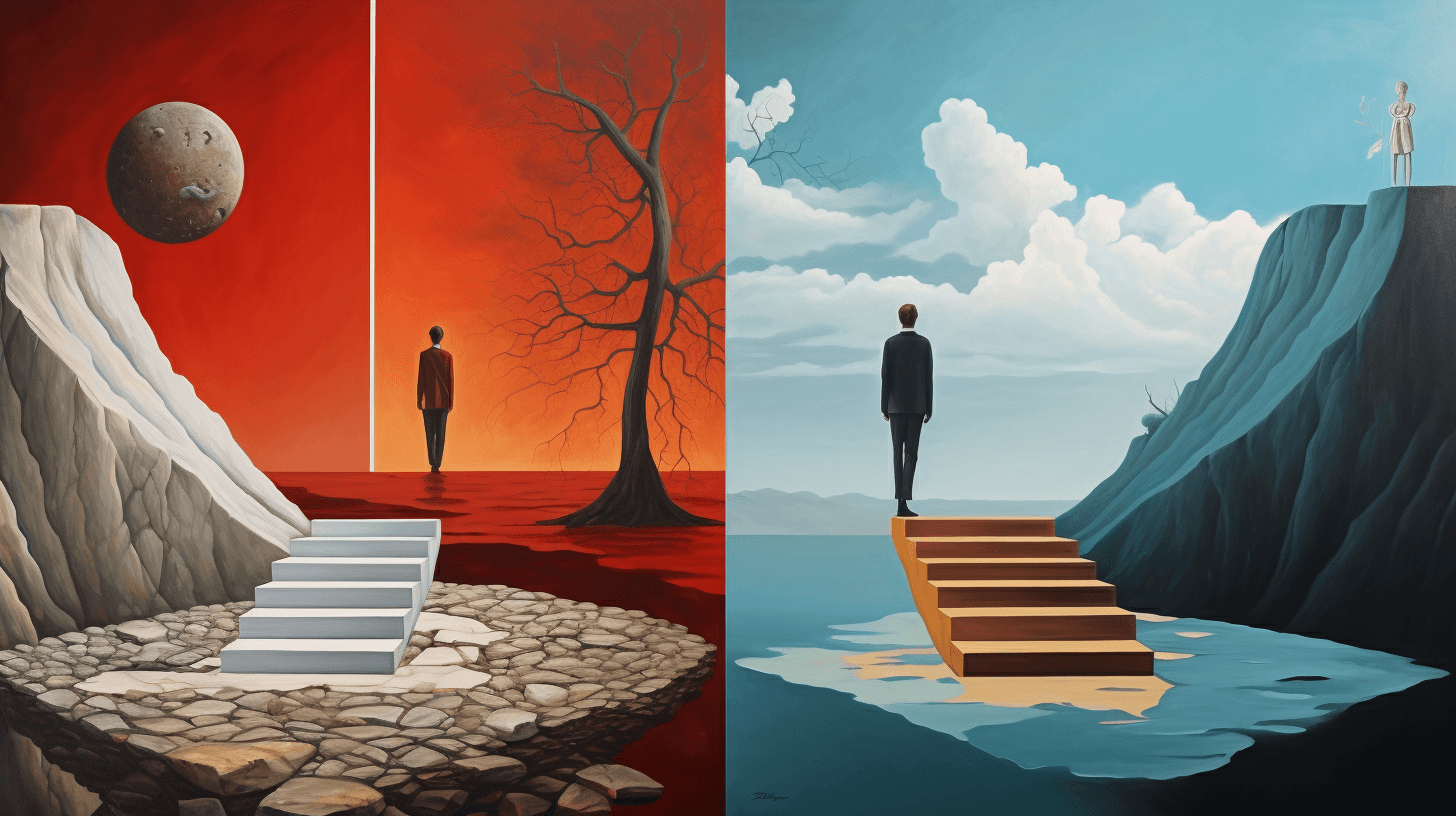 Teköälyn luoma kuva uhista ja mahdollisuuksista. Kumpana sinä näet tekoälyn? Kuva: Midjourney