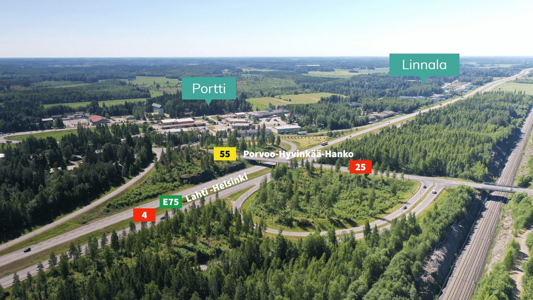 Ilmakuva Mäntsälän eteläisestä moottoritieliittymästä. Moottoritien välittömässä läheisyydessä näkyy Portin ja Linnalan yritysalueet.