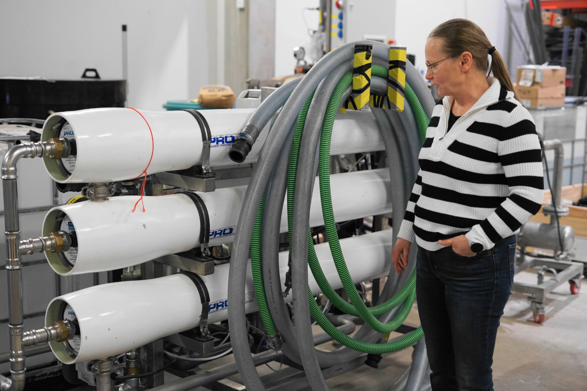 Maija tarkastelee käänteisosmoosilaitetta, jolla tehdään suolapoistettua vettä